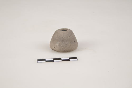 Fuseruola troncoconica con largo foro circolare passante, base piatta. L'argilla è di colore grigio chiara con inclusi ferrosi.