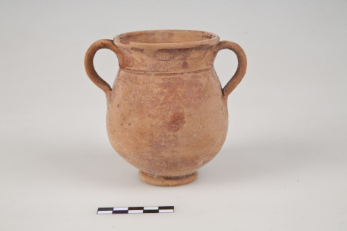 Bicchiere biansato con corpo ovoide, orlo arrotondato, inflesso, base del collo sottolineata da due costolature tipo collarino. Due anse a nastro con incavo mediano impostate appena sotto lattacco dellorlo e sulla spalla, piede ad anello obliquo, con fondo concavo e umbone di tornitura. L'argilla è di colore arancio, la vernice è rosso-mattone, opaca.
