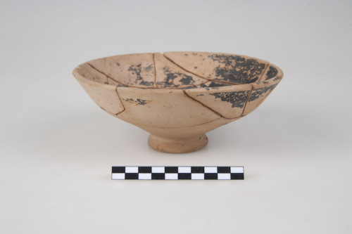 Coppa con orlo leggermente appiattito, vasca poco profonda con lieve carena nella parte superiore, parete svasata nella parte superiore e rastremata in quella inferiore, piede ad anello con profilo arrotondato, fondo esterno con pronunciato umbone di tornitura. Nella vasca interna, al centro, 3 cerchi concentrici leggermente incisi. L'argilla è di colore arancio, vernice nero-bruna, opaca, quasi del tutto scomparsa.