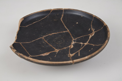Patera con orlo arrotondato, leggermente obliquo verso linterno, vasca profonda, con pareti a profilo convesso e curvatura in prossimità dell'orlo, piede ad anello troncoconico con profilo angoloso, leggermente arrotondato, fondo esterno del piede, piatto. Nella vasca interna, al centro, 3 larghi cerchi concentrici incisi, due più esterni, uno più piccolo, più al centro; decentrato, tracce di disco impresso di impilamento. Tracce di impronte digitali in prossimità del piede e sul piede. L'argilla è di colore beige-arancio, la vernice è nero-bruna, opaca, diluita, vernice marrone-scura nel fondo esterno del piede.