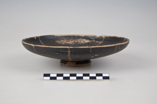 Patera con orlo arrotondato, leggermente obliquo verso linterno, vasca profonda, con pareti a profilo convesso e curvatura in prossimità dell'orlo, piede ad anello troncoconico con profilo angoloso, leggermente arrotondato, fondo esterno del piede con leggero umbone di tornitura. Nella vasca interna, al centro, 3 larghi cerchi concentrici incisi, due più esterni, uno più piccolo, più al centro; tracce di disco impresso di impilamento. Sulla parete esterna, nella parte inferiore, tracce di cerchio inciso. Tracce di impronte digitali in prossimità del piede e sul piede. L'argilla è di colore beige-arancio, la vernice è nero-bruna, opaca, diluita, vernice nero-bruna nel fondo esterno del piede.
