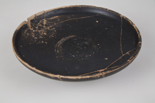 Patera con orlo arrotondato, leggermente obliquo verso linterno, vasca profonda, con pareti a profilo convesso e curvatura in prossimità dell'orlo, piede ad anello troncoconico con profilo angoloso, leggermente arrotondato, fondo esterno del piede con leggero umbone di tornitura. Nella vasca interna, al centro, 3 larghi cerchi concentrici incisi, due più esterni, uno più piccolo, più al centro; decentrato, tracce di disco impresso di impilamento. Sulla parete esterna, nella parte inferiore, tracce di cerchi concentrici incisi. Tracce di impronte digitali in prossimità del piede e sul piede. L'argilla è di colore beige-arancio, la vernice è nero-bruna, opaca, diluita, vernice nero-bruna nel fondo esterno del piede.