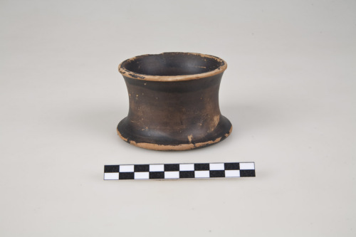 Pisside con corpo cilindrico, pareti concave, orlo arrotondato, leggermente espanso allesterno, parete svasata nella parte inferiore a formare il piede, fondo interno leggermente obliquo e convesso, fondo esterno del piede convesso. Al centro del fondo esterno del piede, umbone di tornitura, nella vasca interna, al centro, segno di impronta digitale. L'argilla è di colore beige-arancio, la vernice è nero-bruna, opaca, diluita con chiazze brune.