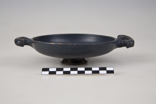 Kylix con anse ad orecchia ripiegate, orlo arrotondato, vasca poco profonda con curvatura in prossimità dell'orlo, piede ad anello a becco di civetta capovolto (con spigolo nel profilo esterno), fondo esterno con appuntito umbone di tornitura, anse ripiegate ad orecchia e impostate subito sotto lorlo. Nella vasca interna decorazione incisa a crudo: 3 cerchi concentrici distanziati, tra i due cerchi più esterni, tre file concentriche di trattini obliqui, irregolari, a rotella, cerchiello inciso al centro della vasca. Al centro della vasca, traccia di disco di impilamento impresso. Tracce di impronte digitali in prossimità del piede e sul piede. Profonde tracce di tornitura sulla parete esterna. L'argilla è di colore beige, la vernice è nero-bluastra, semilucida.