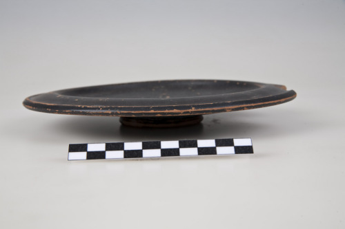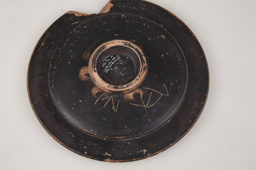 Piatto con labbro a tesa a profilo ondulato (convesso-concavo), orlo ingrossato, obliquo verso lesterno, raccordo bordo-vasca quasi verticale, vasca interna con pareti rettilinee, leggermente concava, piede ad anello, obliquo a profilo arrotondato, con scanalatura sul battente, fondo esterno con lieve umbone di tornitura. Nella vasca interna, al centro 3 cerchi concentrici incisi: due più esterni ravvicinati, uno in prossimità del centro, distanziato dagli altri, leggero umbone di tornitura, scanalature sul labbro nella parte esterna. Sulla parete esterna, in prossimità dell'attacco del piede, segni alfabetici graffiti, dopo la cottura: due sigle. La prima con tratto regolare, poco profondo, ductus destrorso, regolare; la seconda con tratto regolare poco profondo, ductus incerto, interpretato come segno numerale tra due aste, ossia Chi, letto rovesciato = 50. Tracce di impronte digitali in prossimità del piede e sul piede. L'argilla è di colore beige-arancio, la vernice è nero-bruna, opaca, diluita, con chiazze brune.