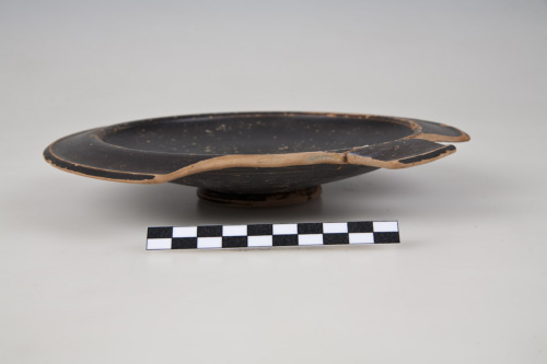 Piatto con labbro a tesa a profilo ondulato (convesso-concavo), orlo assottigliato, obliquo verso lesterno, raccordo bordo-vasca quasi verticale, vasca interna con pareti leggermente concava, piede ad anello, troncoconico a profilo arrotondato, con scanalatura sul battente, fondo esterno con lieve umbone di tornitura. Nella vasca interna, al centro 2 cerchi concentrici incisi, e leggera impressione a spirale, leggero umbone di tornitura, sulla parete esterna, al raccordo bordo-vasca, scanalature. Tracce di impronte digitali in prossimità del piede e sul piede. L'argilla è di colore beige-arancio, la vernice è nero-bruna, opaca, diluita, con chiazze brune.