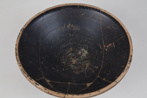 Ciotola con alto orlo arrotondato e inflesso, sottolineato esternamente da 2 scanalature orizzontali, parallele, vasca molto profonda, emisferica, allinterno due coppie distanziate di cerchi concentri incisi. Piede ad anello troncoconico, fondo esterno con lieve umbone di tornitura, irregolare, scanalature e cerchi incisi sulla parete esterna della vasca. Tracce di impronte digitali in prossimità del piede. I iscrizione: nella vasca interna, in prossimità dei due cerchi più esterni, graffita dopo la cottura, con tratto regolare poco profondo, ductus destrorso regolare (Viza Muliu); II iscrizione: sul lato opposto rispetto alla prima, allinterno della fascia compresa tra i cerchi incisi, lettera graffita dopo la cottura, con tratto irregolare profondo (khi); III iscrizione: nella parete esterna, in prossimità dell'attacco del piede, lettera grsffita dopo la cottura, con tratto regolare poco profondo, ductus incerto (l sinistrorso oppure p destrorso). Relativamente alla I iscrizione viza muliu si tratta di una formula bimembre maschile, prenome + gentilizio al grado zero. Il prenome viza si ritrova in ambito etrusco. Il gentilizio muliu non presenta confronti in ambito etrusco, ma potrebbe derivare dal prenome venetico molo, connesso con la radice latina molo (macinare) a cui è stato aggiunto il suffisso gentilizio etrusco -iu. L'argilla è d colore beige-arancio, la vernice è nero-bruna, opaca. Cfr. per l'iscrizione IG 14167, 14177, 14188 della stessa tomba.