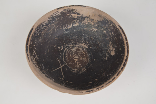 - ISCRIZIONI I iscrizione: nella vasca interna, sulla parete superiore; II segno: sul fondo della vasca interna, in prossimità del centro; III segno: sulla parete esterna, in prossimità dell'attacco del piede - I iscrizione: k vi mx II segno: X III segno: X - lettere capitali - a graffito - Etrusco