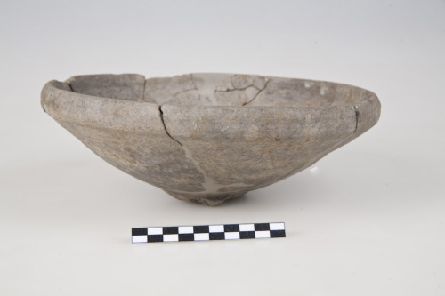 Mortaio con orlo esternamente ingrossato, ripiegato verso l’interno, a sezione sub triangolare, ampia e profonda vasca con pareti convesse, piede forse ad anello, sul fondo interno, pochi inclusi ferrosi costituenti la grattugia, sulla parete esterna, scanalatura orizzontale. L'argilla depurata è di colore grigio-chiara, con inclusi micacei, tracce esterne di ingobbio nero.