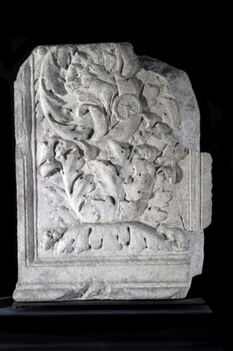Stipite di monumento funerario, incorniciato da una semplice modanatura a listello piatto e gola rovescia, ornato con un grande cespo d'acanto, dai cui girali, al centro, emerge un auriga su una biga in corsa; ai lati due uccellini, mentre alla base del cespo, a destra, un leprotto intento a brucare, a sinistra, la testa di un serpente che divora una rana. Sul lato sinistro, incorniciato dallo stesso tipo di modanatura della fronte, è scolpito ad altorilievo un fusto a foglie embricate. Il lato posteriore è lavorato a martellina.