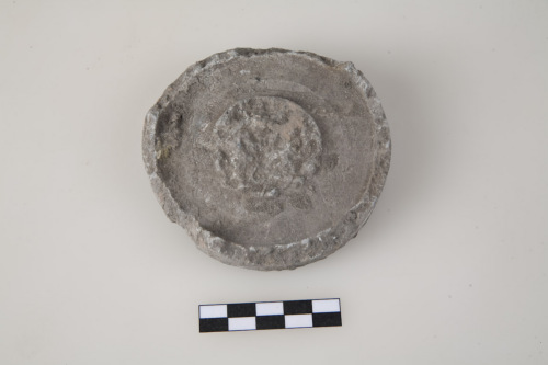 Fondo piatto di vaso in pietra ollare di colore grigio scuro, al centro, cerchio inciso e rialzato con solcature irregolari. Traccia di parete rettilinea.