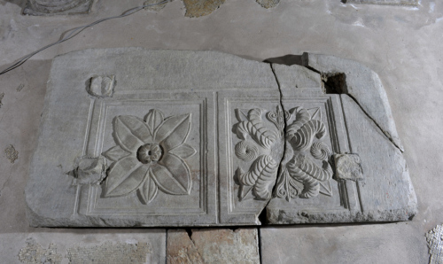 Lastra rettangolare con due grandi cassettoni (o lacunari) ricavati su un piano ribassato poco profondo, separati da riquadrature modanate con doppio listello e gola rovescia, decorati al centro da eleganti motivi floreali resi con ricchi particolari accuratamente dettagliati. Nel primo lacunare, un rosone a quattro petali e foglie alternati, con nervature delineate da profonde linee solcate mediane e lungo i contorni, intorno a un bulbo centrale costituito da un piccolo fiore con le stesse caratteristiche di quello più grande, trapanato al centro; nel secondo, una composizione più complessa, ottenuta con l'accostamento di quattro gigli disposti intorno a un bulbo centrale piatto, non lavorato, alternati a steli stilizzati con foglie arricciate verso l'interno e a fiori a girandola. Agli angoli quattro incassi quadrangolari, di cui tre conservano i residui dei quattro pilastrini che reggevano la mensa dell'altare e uno la lamina plumbea funzionale al loro allettamento.