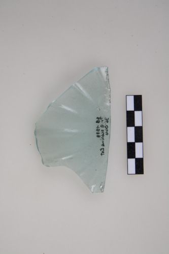 Frammento di parete di coppa emisferica decorata con costolature verticali radiali a basso rilievo. Il vetro è di colore verde azzurro, trasparente.
