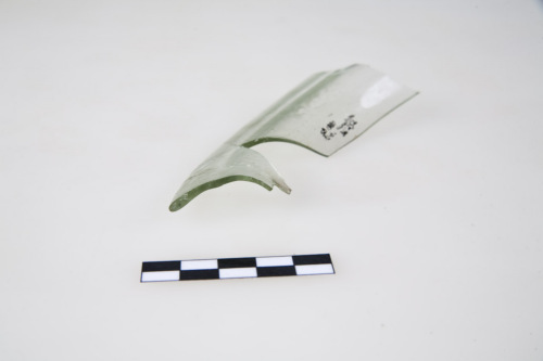 Frammento di orlo di piatto a tesa orizzontale, a profilo arrotondato, sottolineato esternamente da una costolatura orizzontale, pareti a profilo convesso. Il vetro molto sottile è di colore verde chiaro, trasparente.