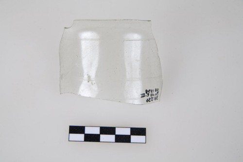 Frammento di bicchiere a corpo cilindrico con orlo esoverso tagliato e levigato, incisioni a ruota circolari, orizzontali e parallele sotto lorlo, e sul ventre. Il vetro molto sottile è incolore, trasparente.