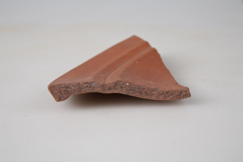 Frammento di patera/scodella in terra sigillata africana D, parete espansa a profilo convesso con fondo della vasca interna piatto, orlo ad andamento spezzato, costituito da due parti: una più esterna con labbro ingrossato a sezione sub triangolare, pendente verso il basso e una più interna unita alla precedente a spigolo vivo, sottolineato da un listello poco rilevato, e avente andamento angolare. Lorlo è unito alla parete a spigolo vivo ed è inclinato verso linterno. L'argilla è di colore arancio-rossastra, la vernice interna ed esterna è rosso-arancione, liscia, opaca.