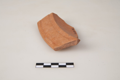 Frammento di patera in terra sigillata africana D, con orlo a tesa orizzontale piana e due sagomature circolari, parallele, sottolineata esternamente da incisione circolare, labbro arrotondato, parete a profilo convesso. L'argilla è di colore arancio-rosata, la vernice è arancio, liscia, opaca.