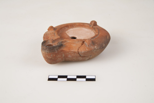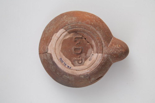 Lucerna "firmalampen" a canale aperto, serbatoio troncoconico con spalla lievemente spiovente, sulla spalla, 3 borchiette piramidali con incisione superiore, disco piatto ribassato con foro di alimentazione decentrato, foro di sfiato, al centro del canale, tracce di uso sul foro di bruciatura, fondo piano lievemente ribassato delimitato da 2 anelli, al centro, il marchio LDP, lettere rilevate e apicate. L'argilla è di colore rosso-arancione.