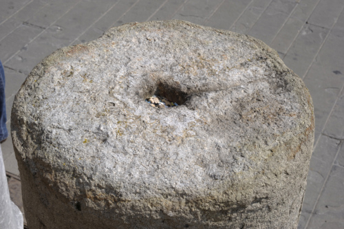 Fusto liscio di colonna, con incasso a sezione circolare al centro del piano di attesa per l'inserimento del perno e canale laterale per la colatura del piombo.