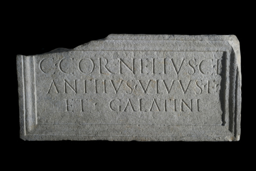 - ISCRIZIONI fronte (all'interno dello specchio epigrafico) - C(aius) Cornelius C(ai) l(ibertus)/Anthus vivus f(ecit) et Galatini - lettere capitali - a incisione - Latina