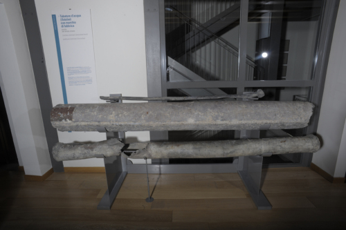 Conduttura idrica (fistula) in piombo, con lamina ribattuta in corrispondenza del giunto di saldatura; in corrispondenza della frattura si distingue parte di un bollo entro cartiglio con il nome del plumbarius che fabbricò la conduttura dell'acqua della colonia concordiese.
