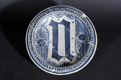 Piatto con cavetto a calotta ribassata e tesa orizzontale, con bordo ispessito superiormente, piede con cercine a sezione trapezoidale con due fori passanti per la sospensione eseguiti prima della cottura. Il corpo ceramico, marnoso di colore giallino, è completamente ricoperto da smalto di colore grigio pallido. All'interno del cavetto vi sono le tracce del distanziatore a tre punte utilizzato per la cottura. La decorazione pittorica, ottenuta con i colori azzurro e azzurro scuro, è caratterizzata da un medaglione centrale nel cavetto, con all'interno la lettera gotica "U", a sua volta racchiusa in una cartella che ne ripete il contorno; la lettera presenta al proprio interno una fascia di motivi geometrici in celeste pallido, mentre il contorno esterno contiene fiori di bryonia, ridotti a semplici gruppi di punti in zaffera. Ai lati elementi floreali silizzati, a corti segmenti radiali, mentre sulla tesa si distingue una fascia composita di bande di vario spessore che racchiudono una sequenza di foglie cuoriformi. La superficie esterna è smaltata, ma non decorata.