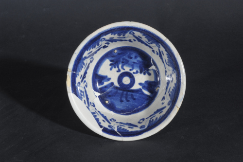 Scodella con cavetto a campana con orlo leggermente esoverso e bordo assottigliato, piede con cercine poco sviluppato. Il corpo ceramico, marnoso di colore giallino, è completamente ricoperto da smalto di colore biancastro, distribuito in modo disomogeneo e con accumuli all'esterno. All'interno del cavetto vi sono le tracce del distanziatore a tre punte utilizzato per la cottura. La decorazione pittorica, in azzurro, consta di un medaglione centrale nel cavetto, con un motivo geometrico di problematica identificazione, reso all'interno di un paese delineato in modo essenziale. La cornice presenta un motivo floreale stilizzato e la parete del cavetto è decorata da una sequenza di mezze palmette con sottili racemi, mentre l'esterno è decorato da pennellate radiali.