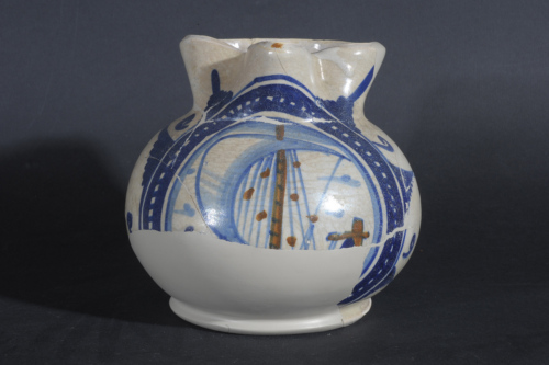 Boccale di forma globulare, con bocca trilobata dal bordo ispessito e versatoio ristretto, larga ansa a nastro impostata a circa metà del collo e appoggiata sul ventre con una terminazione a punta; piede espanso con spigolo smussato. Il corpo ceramico, di impasto compatto e di colore giallo, è ricoperto da uno smalto color grigio perla, visibile fino al piede. La decorazione pittorica, in azzurro scuro, consta di un medaglione ventrale che si estende in posizione frontale fin quasi alla bocca, con all'interno l'albero con vela, sartiame, e parte dell'opera morta (parte di uno scafo) di una nave. Intorno si sviluppa una corona dentata accompagnata da una sequenza di palmette peduncolate con elementi intermedi.