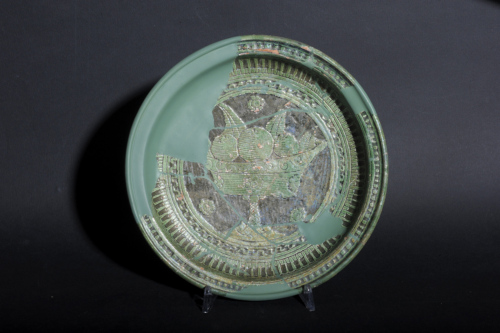 Piatto a fondo piatto con parete curva e breve tesa orizzontale a bordo ispessito, piede a basso cercine con sezione rettangolare. Il corpo ceramico, di argilla depurata, è ricoperto completamente da ingobbio bianco e vetrina monocroma verde. La decorazione pittorica, in verde, consta di una grande coppa su alto piede, ripiena di frutta, all'interno di un medaglione, su fondo a risparmio decorato a rosette. Il medaglione è incorniciato da fasce concentriche con un nastro a meandri e a sgusci; sulla tesa fascia a dentelli risparmiati.
