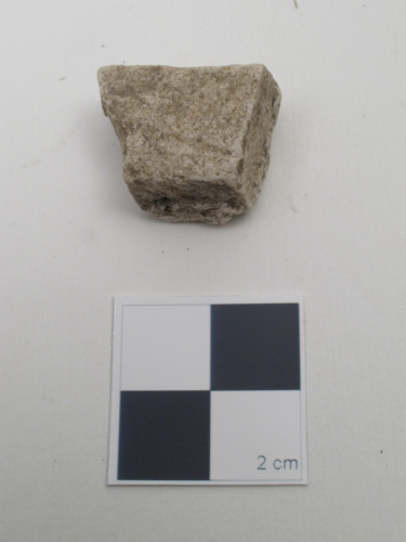 Tessera musiva da pavimento in calcare bianco, del tipo a dadino, a forma trapezoidale.