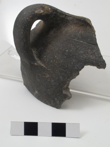 Ansa e corpo di un recipiente di forma chiusa, probabilmente una brocca. Di forma ovoidale, ha bordo semplice, appena estroflesso, a cui si attacca direttamente lansa. Lansa, non sormontante, è a nastro, e a sezione ellittica. Appena sotto lattacco dellansa vi è il solco di una linea incisa orizzontale. La brocca è stata utilizzata sul fuoco con esposizione diretta della parete alla fiamma.