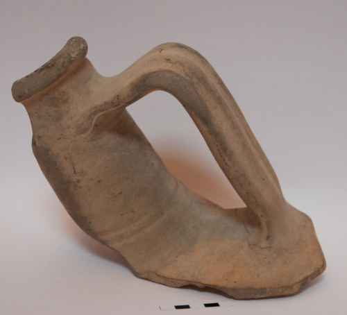 Collo danfora con anse. Il labbro è estroflesso a sezione cilindrica e ad anello. Il collo è troncoconico e si rastrema dolcemente verso la spalla, segnata decisamente da un andamento orizzontale. Lansa è a nastro con profonda solcatura centrale che produce una tipica forma bifida. Sono presenti evidenti schiariture superficiali, e forti i segni del tornio al'interno del collo. Fratture molto levigate da fluitazione in acqua residui di calcare provocati da microrganismi marini durante la permanenza in acqua salata di laguna o mare.