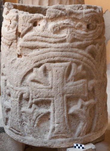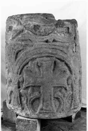 Vera da pozzo circolare in pietra dIstria, decorata a bassorilievo. La decorazione avviene in due registri sovrapposti. Il registro superiore ha una decorazione di tipo fitomorfa con un tralcio di foglie a tre punte disposte di profilo. Il tralcio e le foglie sono percorsi da solchi che corrono paralleli ai bordi scolpiti creando una decorazione su tralci e foglie del tipo a nastro a tre vimini, di cui quello centrale risulta essere l più largo. Il registro inferiore presenta una decorazione più grande inserita dentro una rappresentazione di uno spazio architettonico semplificato. Si tratta di una serie di quattro arcatelle sostenute da pilastrini e relativi capitelli. Entro ogni arco, così formato, campeggia una croce ad estremità espanse, a cui lati sorgono alberelli stilizzati e semplificati. Sopra i bracci orizzontali della croce sono rappresentati gigli semplificati che emergono dagli angoli interni della croce. I pennacchi tra un archetto e laltro sono decorati con gigli a tre punte. Tutti gli elementi del registro inferiore, come quelli del registro superiore, sono percorsi da un solco parallelo al bordo degli oggetti rappresentati creando leffetto di un nastro vimineo a tre capi, con il nastro centrale assai più ampio degli altri. Lesecuzione del bassorilievo sembra piuttosto corsiva e in alcuni casi irregolare. La vera da pozzo è esternamente a forma di tronco di cono poco rastremato, mentre allinterno è scavato un cilindro regolare di diametro di 56-57 cm. Con ogni probabilità loggetto pare essere il risultato di un re-impiego in età altomedievale di un elemento architettonico di età romana. Le dimensioni e la forma del blocco di marmo, infatti, lasciano pensare ad una base di monumento funerario. Sul registro superiore, inoltre vi sono alcuni grandi fori rettangolari, probabilmente posteriori alla decorazione di IX secolo, e relativi allaggancio di una qualche struttura presso la vera da pozzo, forse relativa allattingimento dellacqua.