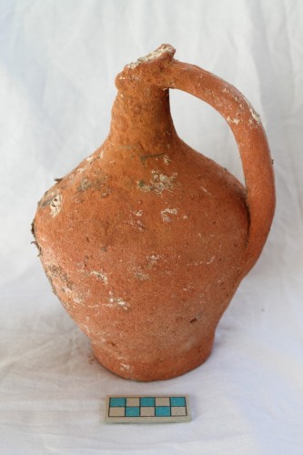 Brocca con piede a disco rilevato e nettamente distinto dal corpo, che presenta un profilo ovoidale. La spalla degrada verso un breve collo cilindrico svasato mentre l'orlo è leggermente estroflesso e arrotondato, interrotto solo dalla presenza del piccolo beccuccio versatore. Specularmente ad esso è presente una ansa a nastro che presenta una evidente nervatura rilevata centrale.