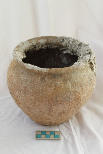 Olletta con piede a disco, corpo a profilo globulare, orlo leggermente estroflesso e labbro arrotondato.