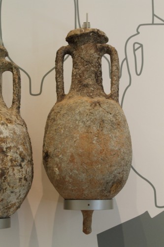 Anfora con corpo a profilo ovoidale, collo cilindrico leggermente svasato superiormente e orlo a sezione triangolare. Il corpo termina con un puntale troncoconico appiattito inferiormente. Le anse presentano una sezione a nastro e appaiono cadenti sulla spalla.