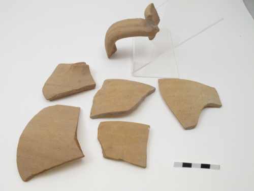 Ansa con attacco sotto il collo di anfora globulare altomedievale, probabilmente di area dellItalia meridionale (Otranto). Presenta il labbro leggermente estroflesso a sezione circolare. Lansa è a gomito, realizzata a bastoncello, con sezione ellittica e presenta le due caratteristiche solcature parallele. Si imposta appena al di sotto del labbro. Largilla è arancio/rosata, con inclusi bianchi. Il manufatto presenta schiariture superficiali.