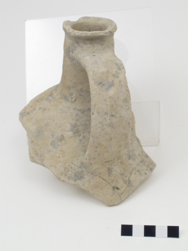 Ampia porzione di anfora del tipo globulare altomedievale, probabilmente proveniente dallarea del Mediterraneo orientale. Il frammento riguarda la parte del collo, con un ansa, all'attacco della seconda ansa e porzione della spalla. Il labbro è leggermente estroflesso a sezione circolare. Sull'ansa, a nastro, è presente una leggera insellatura. Sulla spalla si percepisce un accenno di decorazione a fascio di linee incise, purtroppo non conservata. Sotto l'attacco dell'ansa sulla spalla vi è un graffito post-cocturam recante la lettera "V". Nel punto d'attacco tra il collo e il corpo ceramico vi sono due leggere solcature. Collo a forma leggermente troncoconica. Argilla depurata di colore crema chiaro. Sono presenti Inclusi bianchi anche di grandi dimensioni.