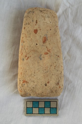 Peso di forma tronco-piramidale, caratterizzato alla sommità da un foro circolare passante funzionale alla sua sospensione sul telaio. Il reperto reca, sulla base minore, quattro piccoli incavi irregolarmente circolari in corrispondenza dei quattro angoli ed un incavo circolare più largo e regolare al centro.