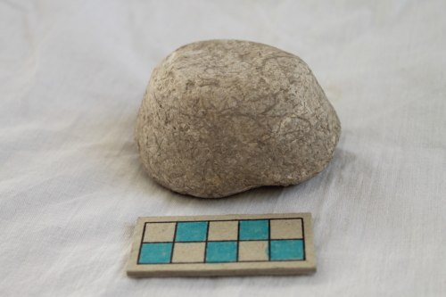 Peso di forma tronco-conica e base ellittica, irregolarmente piana. Sulla base maggiore sonoevidenti le tracce di pernetti di piombo pertinenti ad una maniglia, andata perduta, funzionale ad un gancio per la sua sospensione.