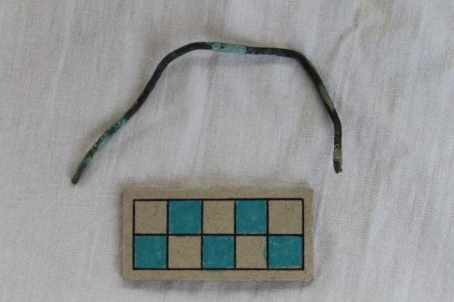 Spillone con testa globulare e attacco di sottile gambo a sezione quadrangolare.