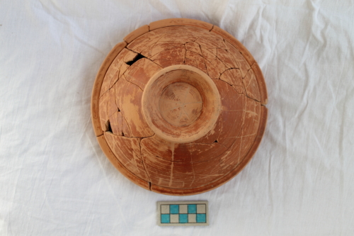 Coppetta con piede ad anello leggermente svasato, corpo a profilo emisferico, orlo verticale con listello aggettante che lo divide dal corpo, labbro assottigliato e arrotondato. Sul corpo, all'esterno, si notano graffiti in post-cottura il simbolo del tridente e della X, ripetuti in tutta la superficie senza simmetria. All'interno, racchiuse entro una incisione circolare, sono graffite tre linee intersecantesi al centro del cavetto a formare una stella, motivo questo che si ripete, con minori dimensioni, anche all'interno del piede ad anello.