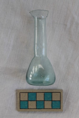 Balsamario con corpo piriforme, non decorato, in sottile vetro soffiato di colore verde/azzurro. Si conservano il largo fondo piatto, il ventre a profilo tronco-conico, una leggera strozzatura che lo divide dal lungo collo cilindrico che termina con un orlo estroflesso obliquo e un labbro tagliato e arrotondato.