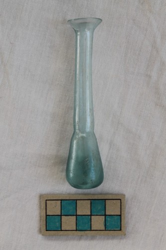 Balsamario di forma tubolare, non decorato, in sottile vetro soffiato di colore verde/azzurro. Si conservano il fondo piccolo e arrotondato, il lungo ventre a profilo tronco-conico,una leggera strozzatura che lo divide dal lungo collo cilindrico che termina con un orlo estroflesso obliquo e un labbro tagliato e arrotondato.