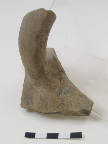 Frammento di ansa a gomito, con lattacco alla spalla, di anfora globulare altomedievale. Fenomeni legati a trasformazioni subite durante la giacitura secondaria hanno alterato la superficie e non è agevole fare ulteriori determinazioni. Il frammento presenta unansa a bastoncello, a sezione ellittica, che si impostano sulla spalla.