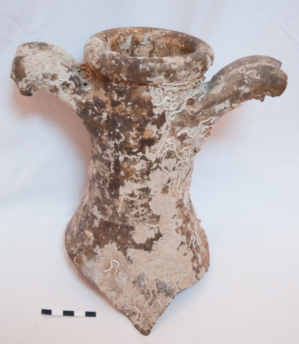 Frammento con la parte del collo di anfora vinaria tipo Dressel 2-4, di produzione adriatica (Dressel 2-4 Italic). L'anfora presenta labbro ad anello circolare semplice. Il collo è a sezione troncoconica. Le anse, conservate solo nell'attacco sotto il labbro, sono estroflesse e non sormontanti, si impostano 1 cm sotto il labbro. Sono caratteristicamente formate da coppie di bastoncelli a sezione circolare, che conferiscono all'ansa una sezione complessiva bifida. Abbondanti le incrostazioni di tipo marino, che denunciano un chiaro rinvenimento in ambiente acquatico. Argilla colore nocciola, dura.