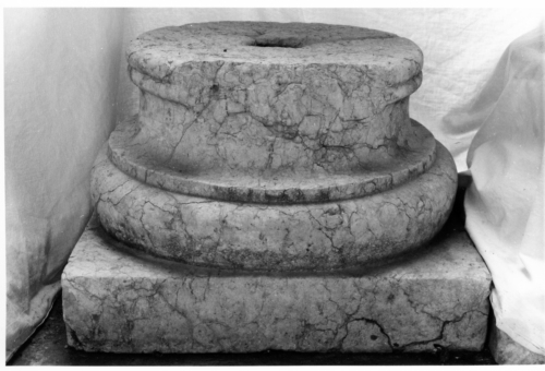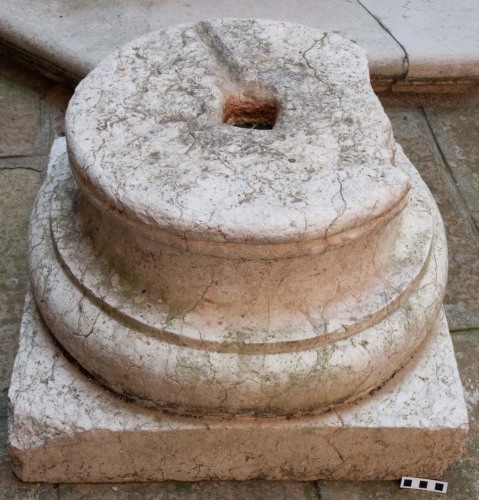 Base di colonna in broccatello giallo di Verona, con alto plinto rettangolare. Vi è unampia scozia tra un toro semicircolare e una coppia di tori, in alto, appena segnati. Il toro inferiore è molto spesso e tra questo toro e la scozia si distingue un listello. Presente un incavo pseudo quadrato per il fissaggio della colonna stessa, e un piccolo canalino per facilitare le operazioni di ammorsamento tra colonna e base. Parte dellimoscapo è stato asportato in passato mentre la colonna era in situ, probabilmente per lalloggio di qualche arredo architettonico. La base di colonna presenta stringenti confronti con le colonne di XIII secolo impiegate nel Chiostro di Santa Apollonia, adiacente alla fabbrica marciana. Può essere associata stilisticamente alle basi di colonna MAV 861, 863, 864, 865, 866, 868, 869.