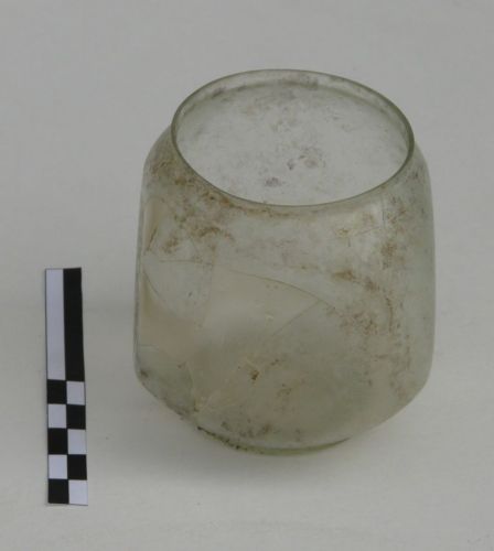 orlo tagliato a spigolo vivo e levigato, labbro quasi diritto, distinto; linea incisa a mola sulla spalla; corpo cilindrico quasi cubico con quattro depressioni ovali poco profonde, piede ad anello (ricavato dal fondo); fondo appena incavato