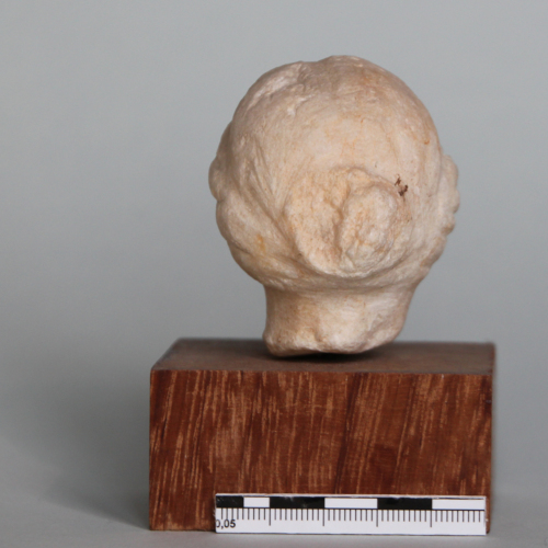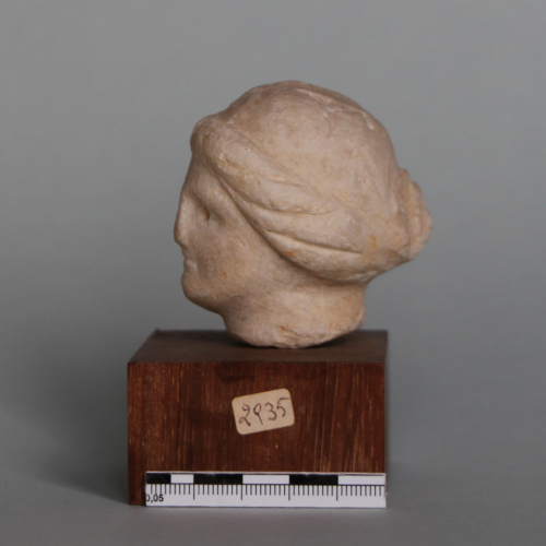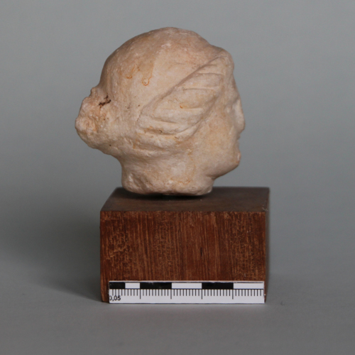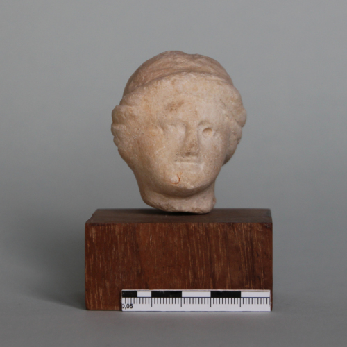 La testa, di dimensioni molto ridotte, raffigura un volto dall'ovale pieno, racchiuso da guance paffute e da un mento rotondo. Il viso è lievemente reclinato verso sinistra e si presenta caratterizzato da una stretta fronte, marcata da arcate sopraccigliari rese incavando debolmente il marmo. Gli occhi sono piccoli, mentre il naso diritto risulta parzialmente abraso. La bocca, dalle labbra estremamente sottili, è stata resa mediante una debole incisione. I capelli sono raccolti sul retro in uno chignon, mentre sulla fronte sono bipartiti in due bande morbide.