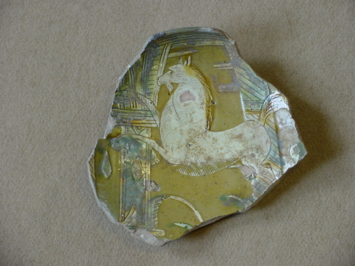 Piatto con piede ad anello leggermente umbonato e attacco di parete a profilo quasi orizzontale. All'interno del cavetto compare un cavallo al galoppo con sullo sfondo un elemento architettonico ad arco. Il decoro è marcato da pennellate di colore giallo e blu.